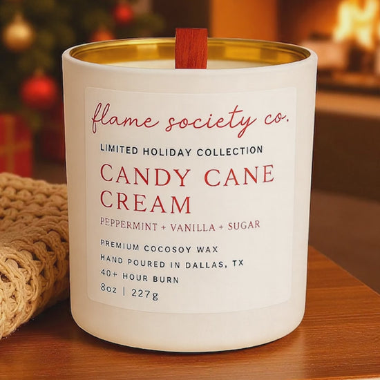 Every candle is hand-poured in small batches in our exclusive matte white vessel with a gold-plated interior and finished with a red crackling wooden wick — a Flame Society Co. signature that sets us apart.
